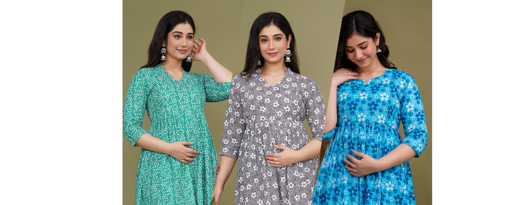 Pure Cotton Maternity Dress With Both-Side Hidden Zip - Combo ocean|black|green